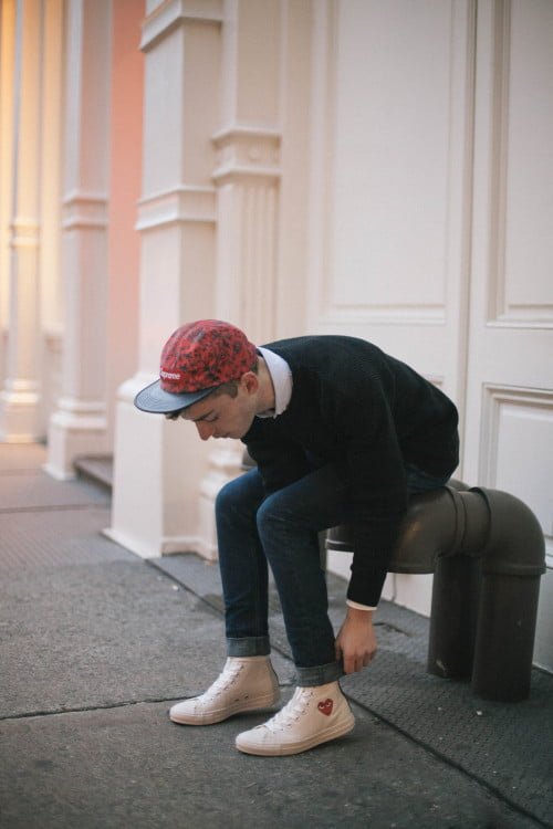 Thêm một cách phối đồ với giày converse cao cổ cho nam cho những ngày thu đông với quần jean xanh đậm kết hợp với giày converse CDG trắng cổ cao cùng áo len bên ngoài và sơ mi bên trong, kết hợp với 1 chiếc mũ lưỡi trai đỏ sẽ làm cho bạn cực kỳ “chất” trong mắt mọi người.