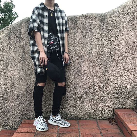 Giày Yeezy 350 v2 + quần jean rách + áo sơ mi kẻ caro