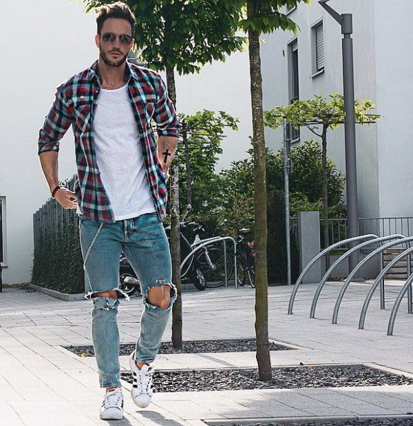 Mix đồ với phong cách đường phố, trông bạn sẽ bụi bặm và ngầu hơn rất nhiều chỉ với sự kết hợp đơn giản giữa giày Adidas Ultra Boost cùng với quần jean rách, sơ mi kẻ caro to bản cùng một chiếc áo phông ngược màu với sơ mi. Cách phối đồ này phù hợp với cả các bạn nam gầy và béo, tuy nhiên thì với bạn nào form người gầy lên dáng sẽ chuẩn “men” hơn.