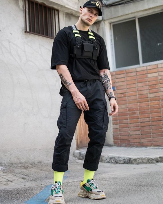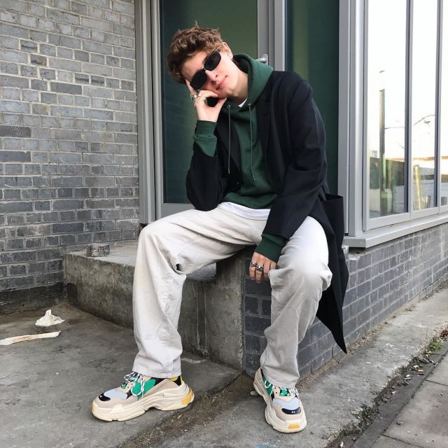 Nếu bạn thích phong cách street style, hãy thử mix đồ như thế này, set đồ với giày Balenciaga Triple S xanh vàng cùng quần kaki rộng và áo hoodie cho bạn một cảm giác thoải mái khi đi ra đường.