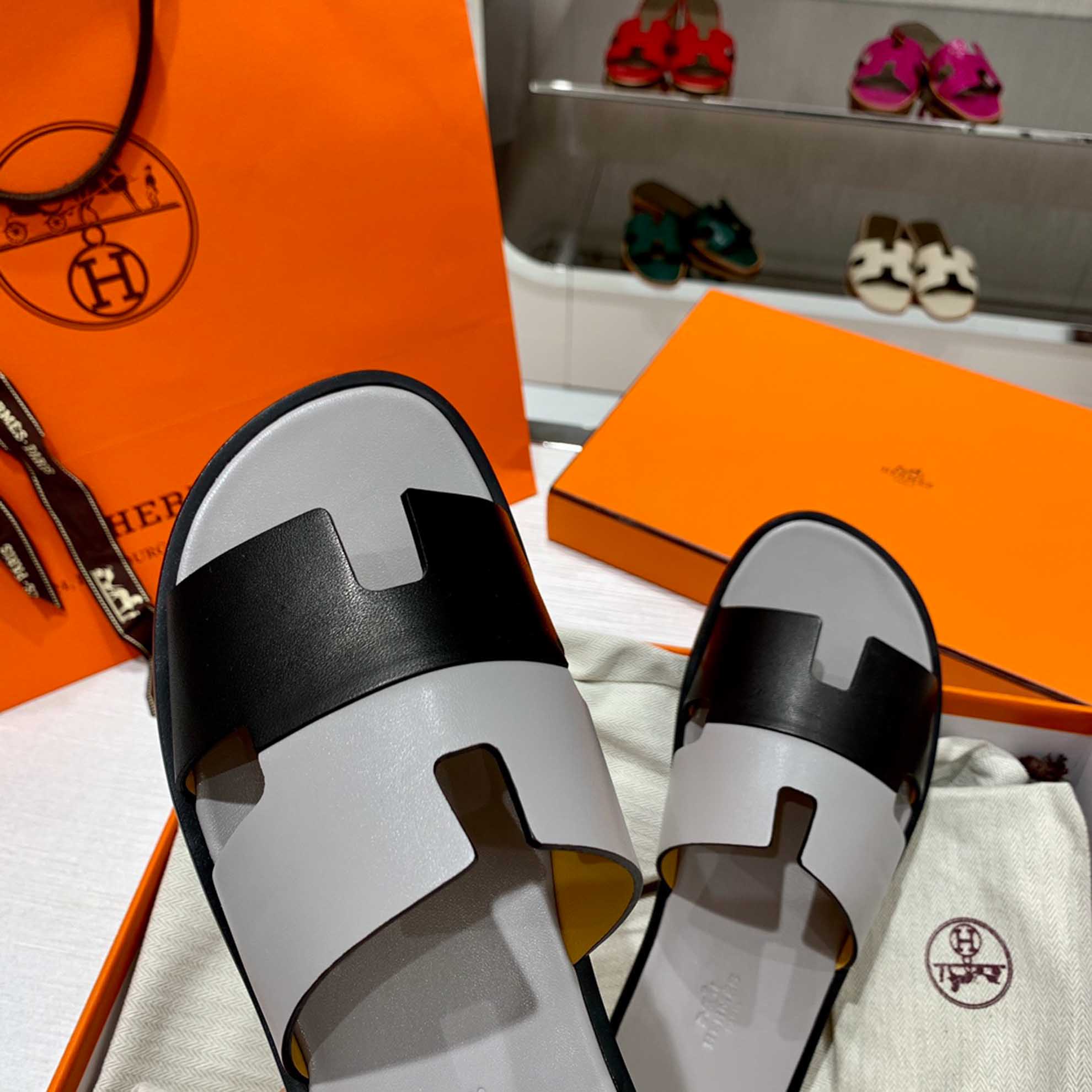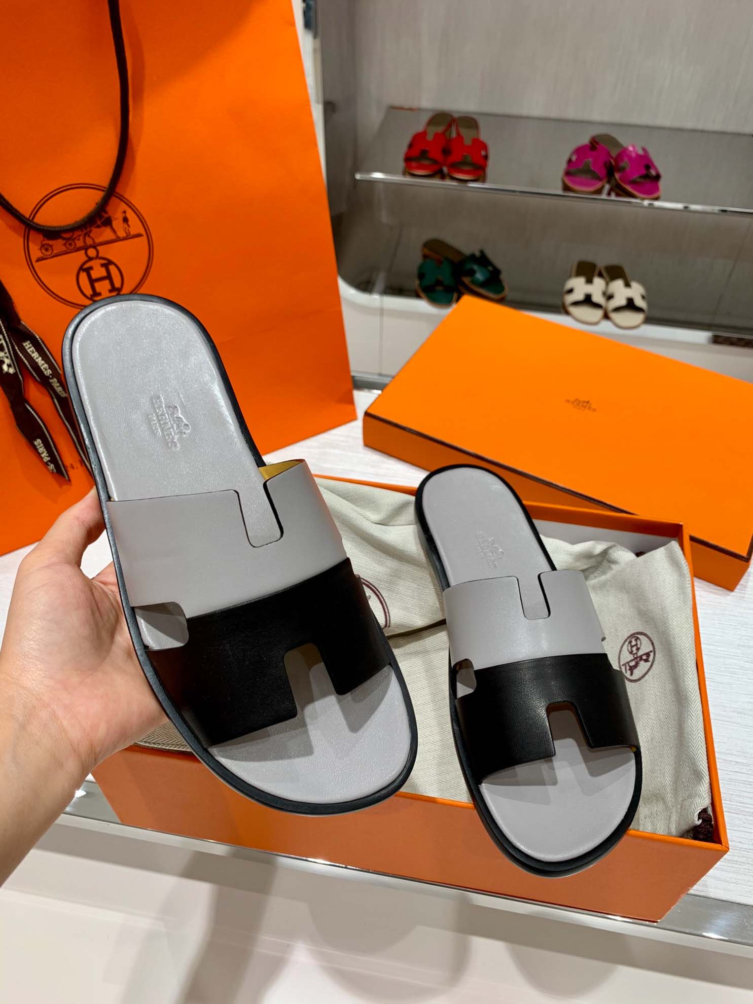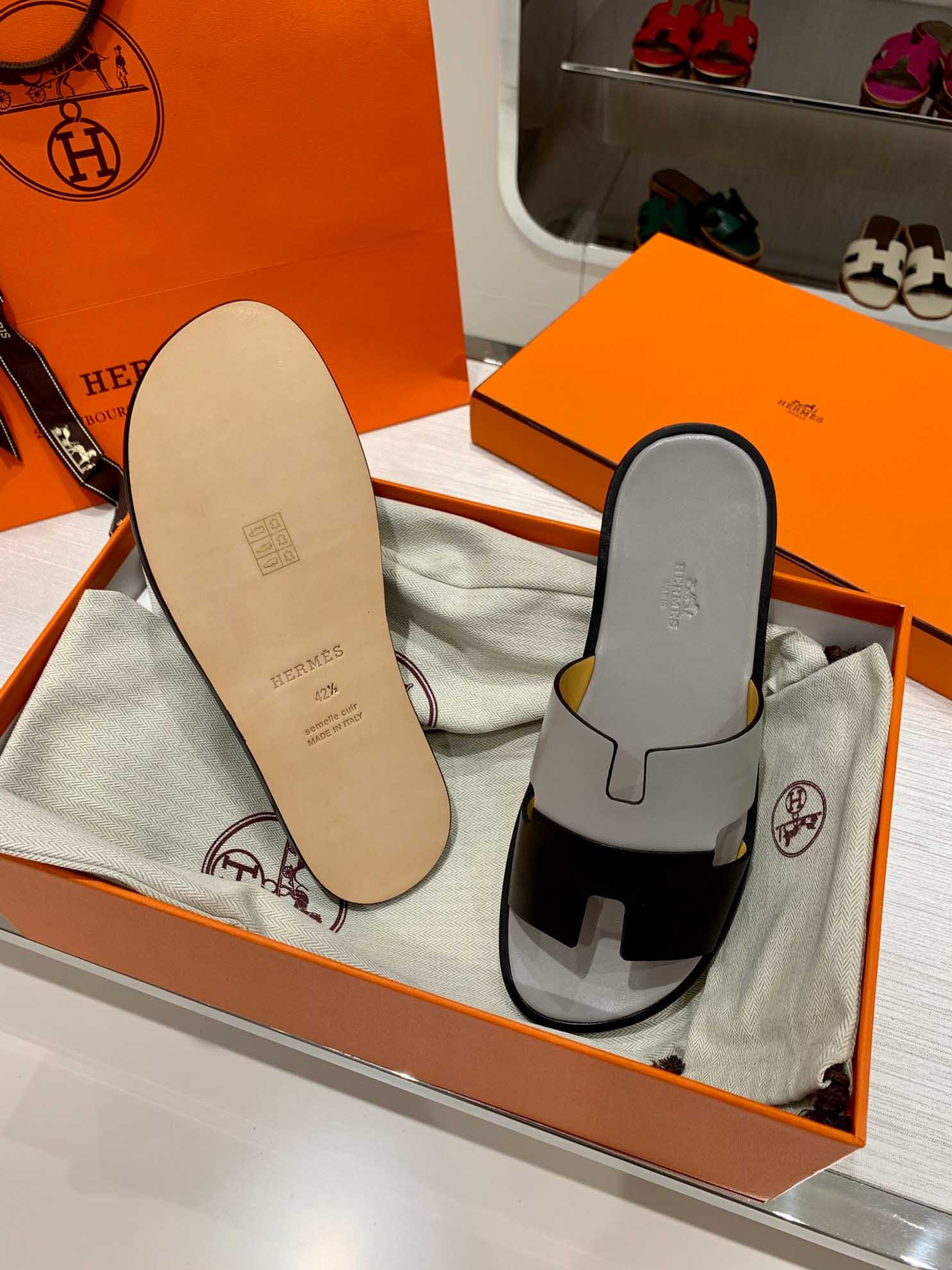 Dép Hermes Nam Da Trơn Bicolor Xám Đen Best Quality
