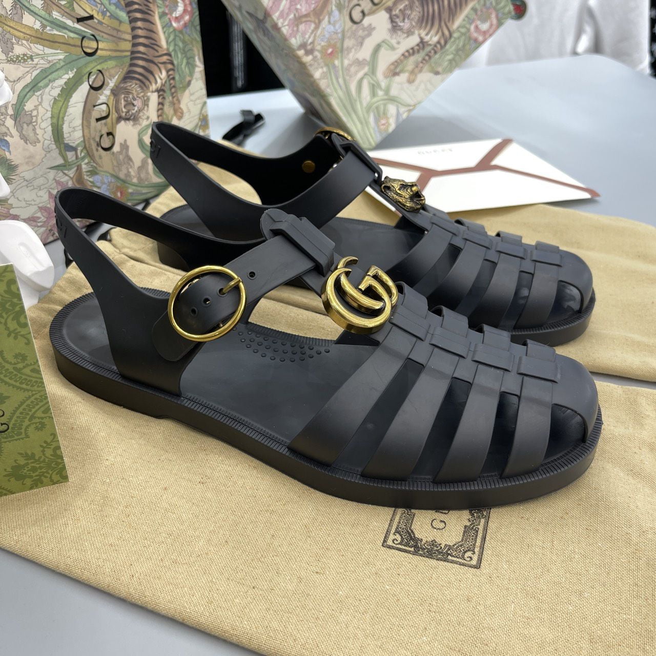 Dép Rọ Gucci mặt Hổ GG Vàng Like Auth