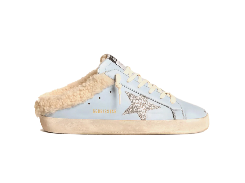 Giày Golden Goose Women’s Super-Star Sabots Silver Glitter Star & Shearling Lining Powder Blue Low Best Quality