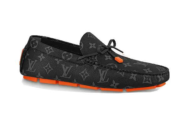 Giày Lười Lv Driver Moca Da Bê Sần Họa Tiết Monogram Canvas Đế Cam