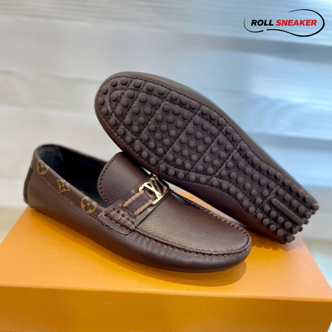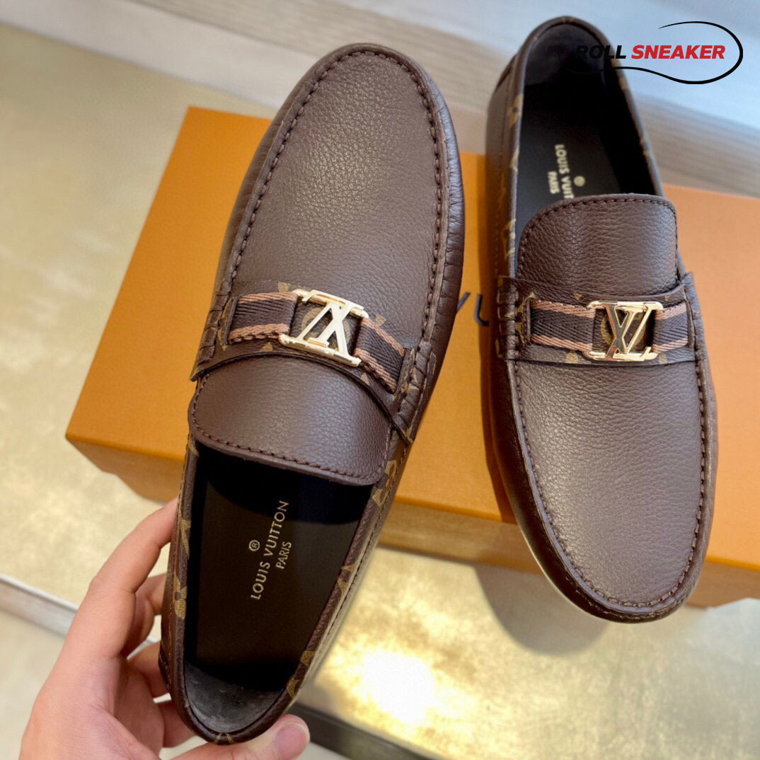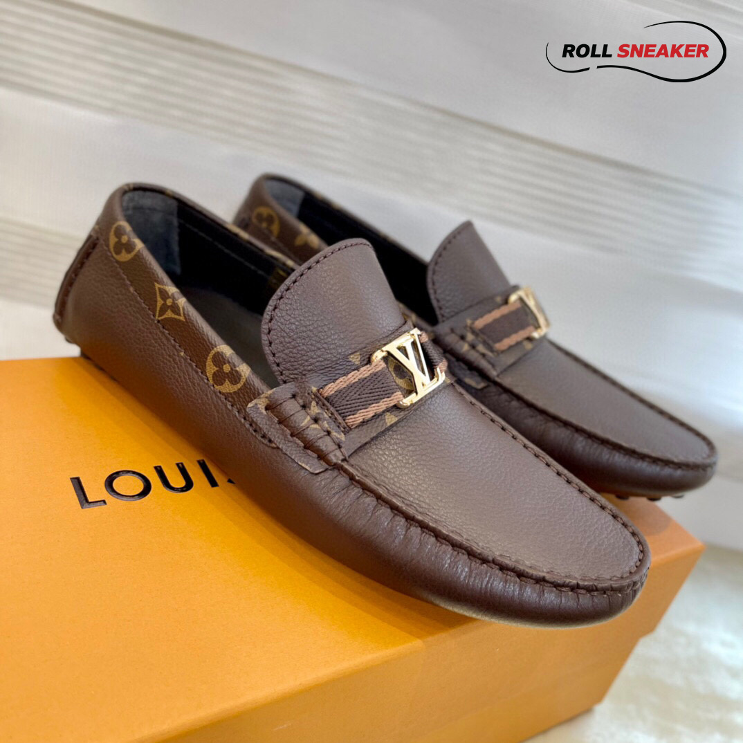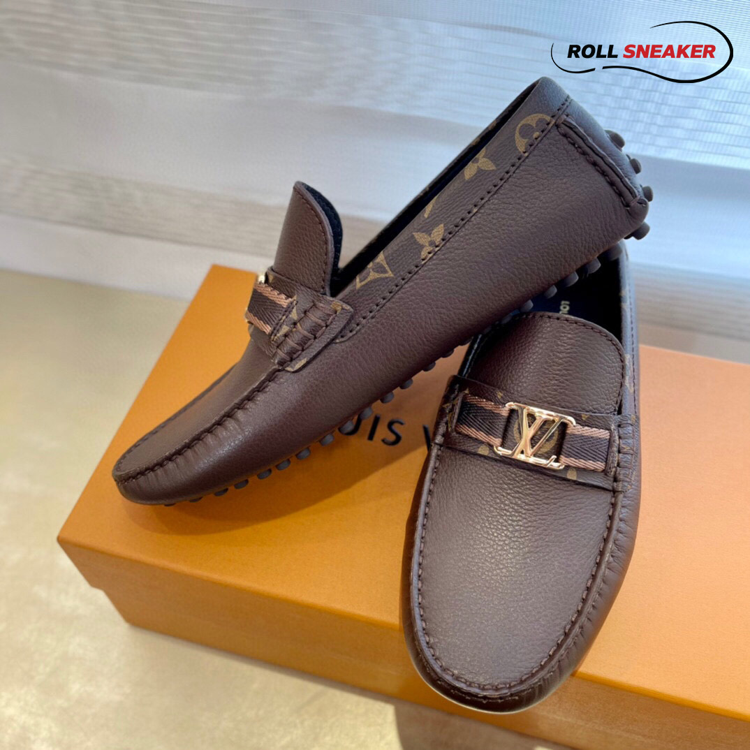 Giày lười LV Hockenheim Moca Brown Da Bê Sần Monogram Canvas Logo LV Vàng