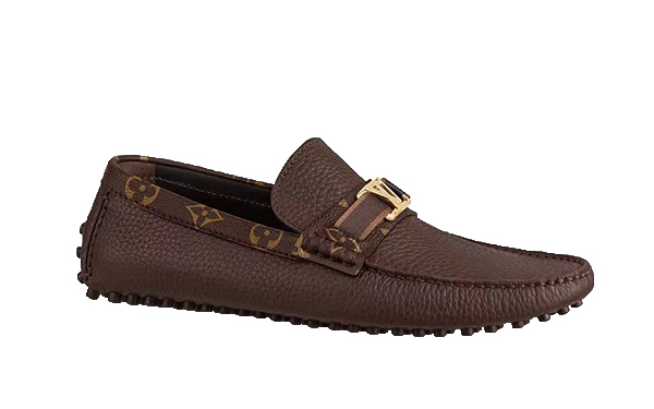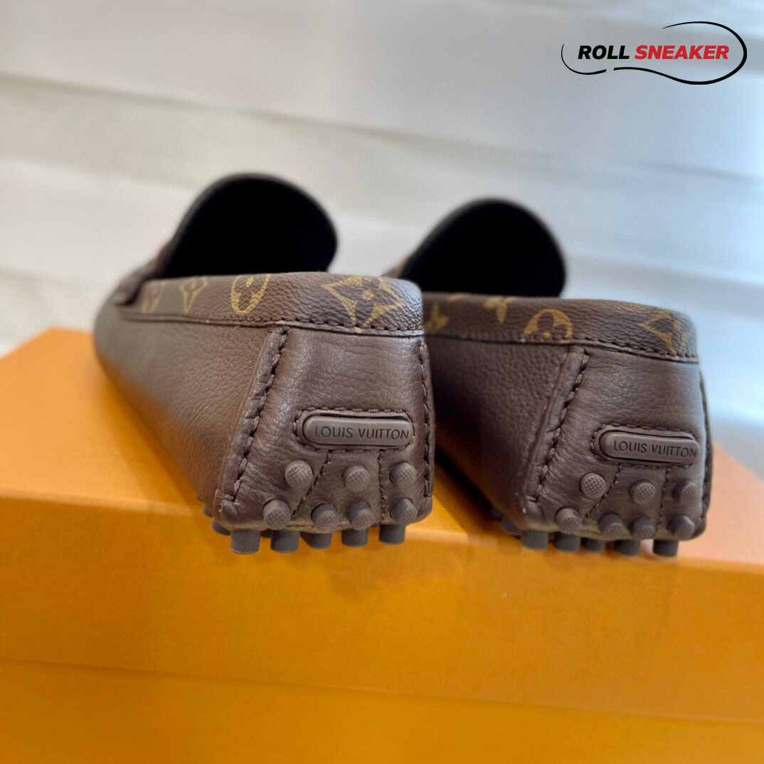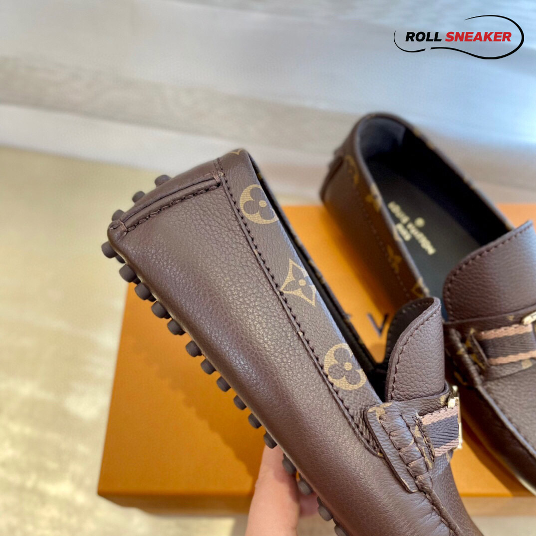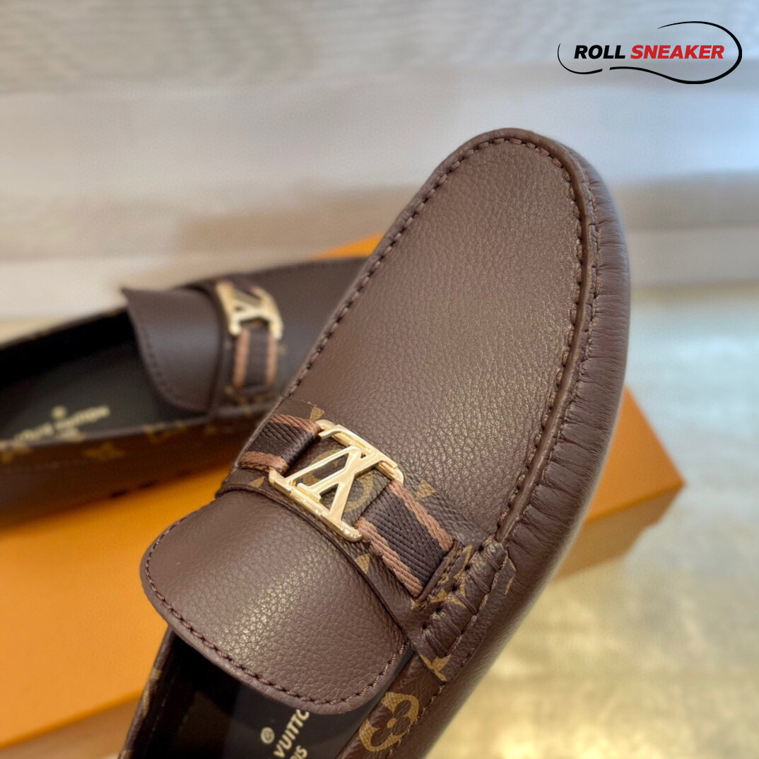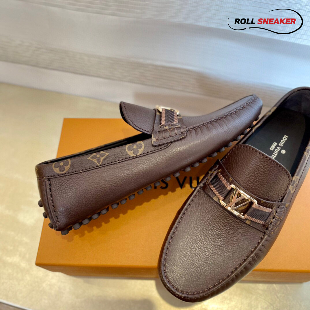 Giày lười LV Hockenheim Moca Brown Da Bê Sần Monogram Canvas Logo LV Vàng