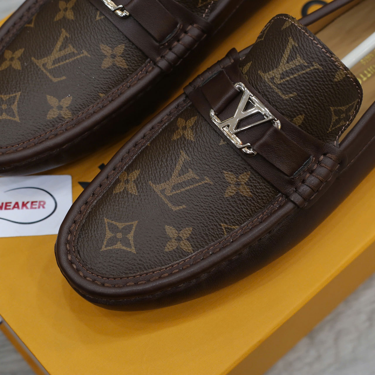 Giày lười LV Hockenheim Mocassin Brown Da Bê Họa Tiết Monogram Canvas Logo LV Bạc