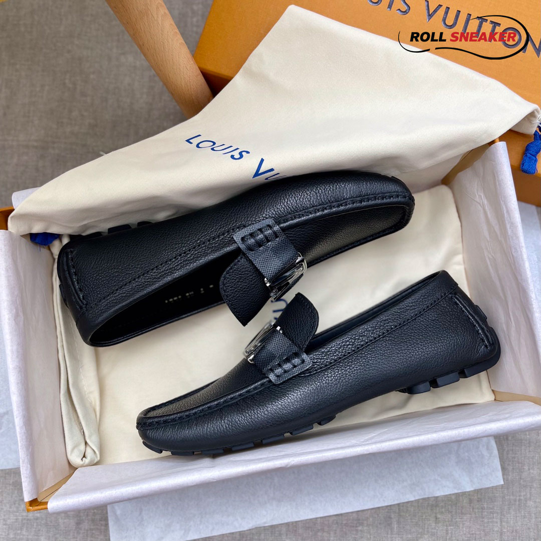 Giày Moca Nam LV Montaigne Monte Carlo Black Da Bê Nhăn Khóa Logo Đen Viền Bạc