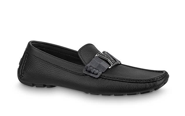 Giày Moca Nam LV Montaigne Monte Carlo Black Da Bê Nhăn Khóa Logo Đen Viền Bạc